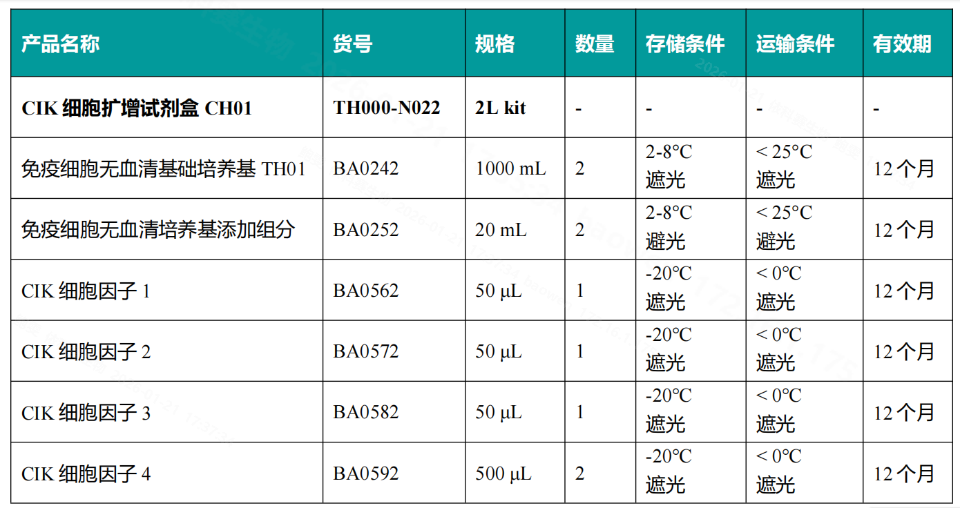 CIK 細(xì)胞擴(kuò)增試劑盒 CH01 是一款專為 CIK(cytokine-induced killer)細(xì)胞培養(yǎng)而設(shè)計(jì)的無(wú)血清、無(wú)異源動(dòng)物源成分的培養(yǎng)基套裝,包括免疫細(xì)胞無(wú)血清基礎(chǔ)培養(yǎng)基 TH01、免疫細(xì)胞無(wú)血清培養(yǎng)基添加組分、CIK 細(xì)胞因子 1、 CIK 細(xì)胞因子 2、CIK 細(xì)胞因子 3、CIK 細(xì)胞因子 4。此套裝適用于人外周血淋巴細(xì)胞(PBMCs)以及臍帶血淋巴細(xì)胞(CBMCs)中 CIK 細(xì)胞的誘導(dǎo)活化培養(yǎng),培養(yǎng)過(guò)程需額外添加熱滅活自體血漿或商業(yè)化人血小板裂解物。